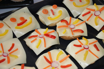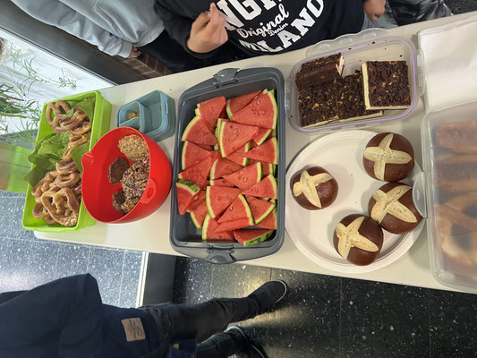 Im Rahmen unserer Arbeit im Bereich der gesunden Ernährung verkauft jede Klasse einmal im Schuljahr ein gesundes Frühstück an die anderen Kinder. Viele Eltern helfen bei der Zubereitung. Die Einnahmen sind jeweils zu 50 % für die Elternspende der Schule und zu 50 % für die Klassenkasse bestimmt.